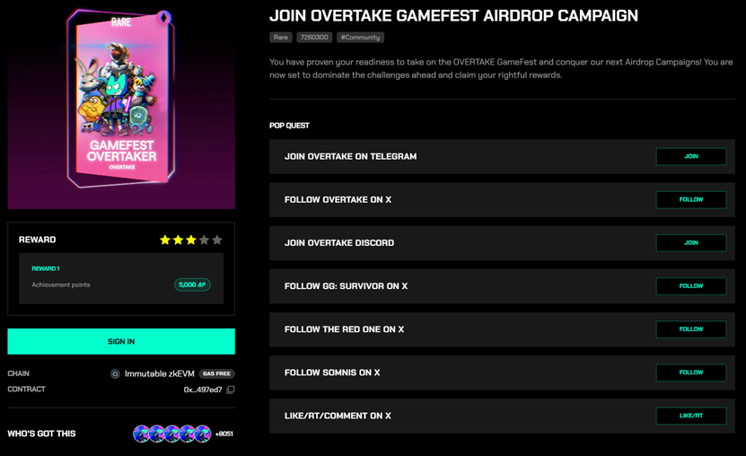 基於 @Immutable 的遊戲平臺 OVERTAKE 將於 14 日啟動 P2A 空投活動,旨在透過分階段的 P2A 讓玩家深入探索 OVERTAKE 平臺及旗下的主要遊戲。