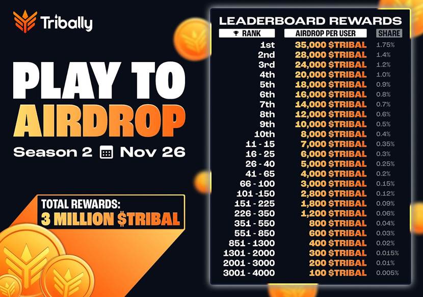 🥇排行榜獎勵:2 百萬 $TRIBAL 分配給排名前 4,000 名玩家,最低獎勵為 100 枚 $TRIBAL。