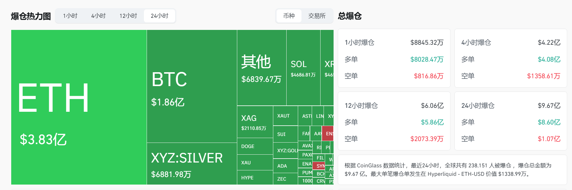 深潮 TechFlow 消息,1 月 31 日,据 CoinGlass 数据,过去 24 小时内加密货币市场总爆仓金额达 9.67 亿美元,其中,多单爆仓 8.60 亿美元,空单爆仓 1.07 亿美元。