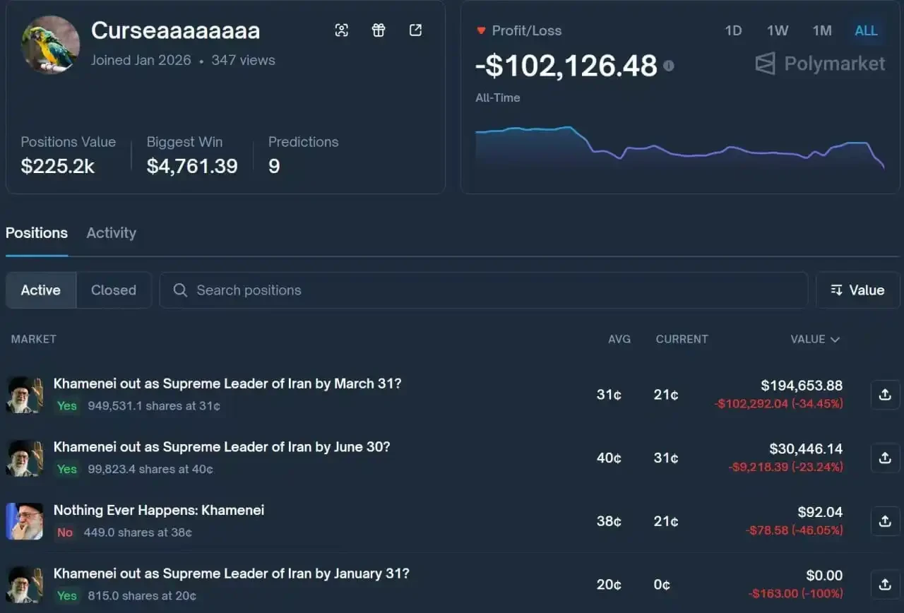 Polymarket 内幕巨鲸大举加注哈梅内伊下台,总押注 $336.7k | 来源:Polybeats