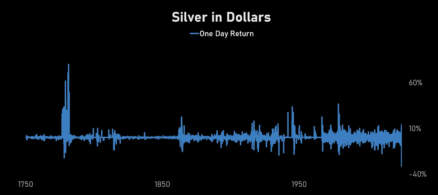 那是白银 275 年的每日收益率数据。上周五的波动是该金属整个历史上最大的单日跌幅之一。我们讨论的是足以媲美金银复本位制终结、Hunt 兄弟崩溃以及 2020 年 3 月的波动——只不过这次发生在 1 月份一个毫无征兆的普通周五。