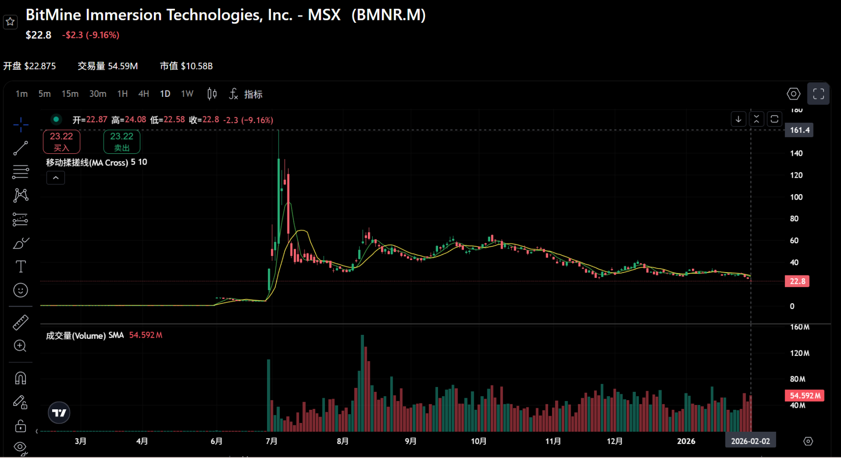 然而,成也以太,败也以太。 随着 ETH 价格的深幅回撤,BitMine 股价的溢价泡沫迅速破裂,目前已一路坠落至 22.8 美元。