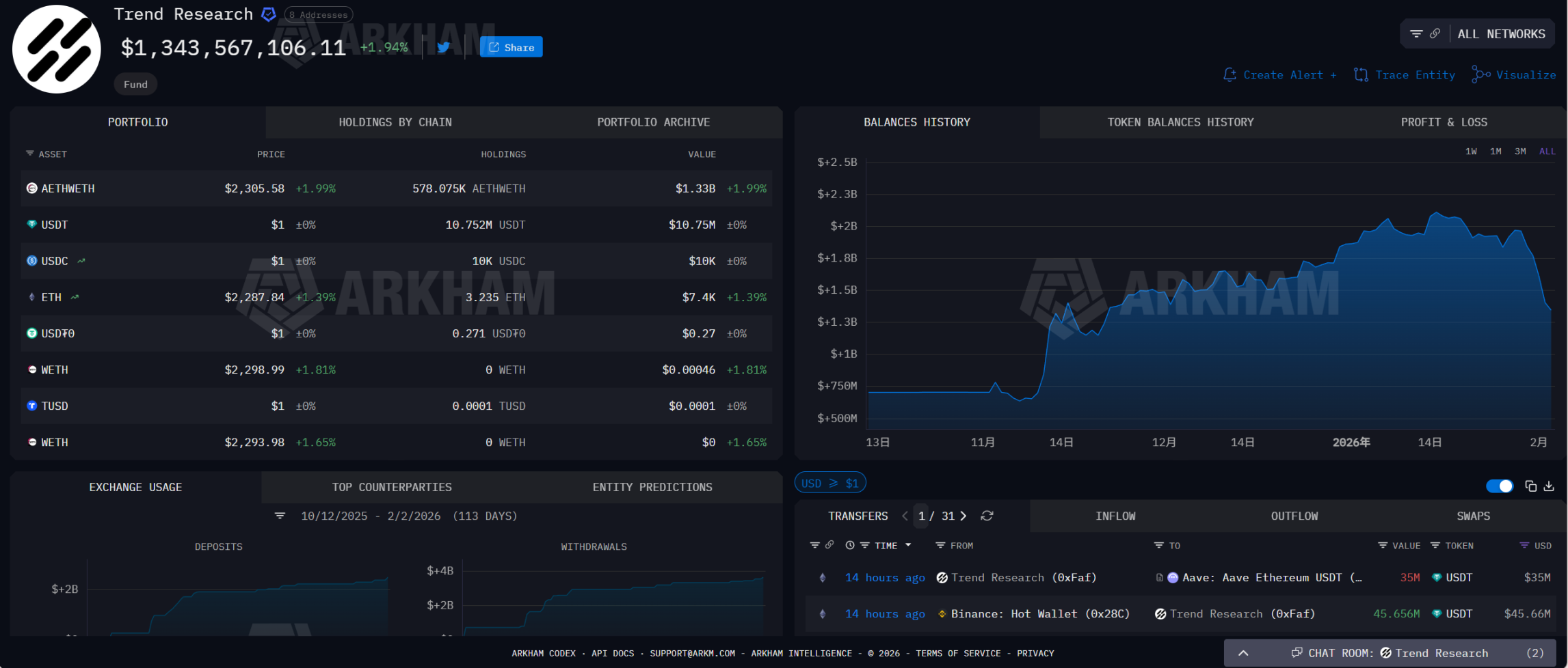 截至 2 月 2 日,Trend Research 已分多笔、累计向币安存入 73588 枚 ETH(价值约 1.69 亿美元)用于出售并偿还贷款,ETH 借贷仓位总亏损达 6.13 亿美元,包含已实现亏损 4742 万美元及浮亏 5.65 亿美元,当前仍背负稳定币杠杆借款约 8.97 亿美元。