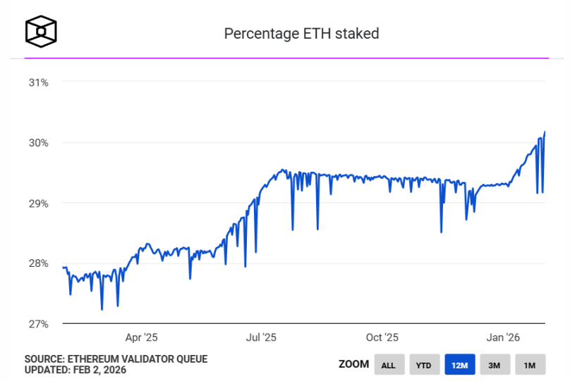 要知道此前的质押率最高纪录为 29.54%,出现在 2025 年 7 月,而本轮,也是以太坊自进入 PoS 时代以来,质押率首次实质性跨越了 30% 的红线。