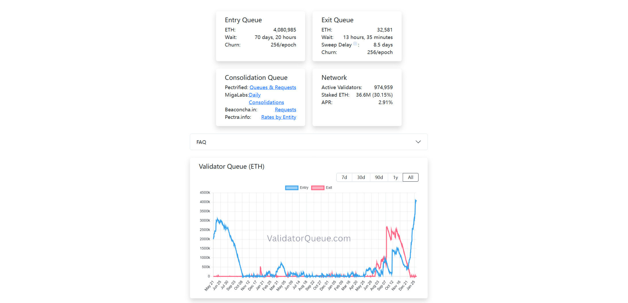 与此同时,验证者队列也出现了微妙的变化,其中质押退出队列近乎清空,而进入质押的队列却在持续拉长,超过 408 万枚 ETH 正在排队等待「入场」,一句话概括当前状态,「退出顺畅,进门却要排 7 天的队」。
