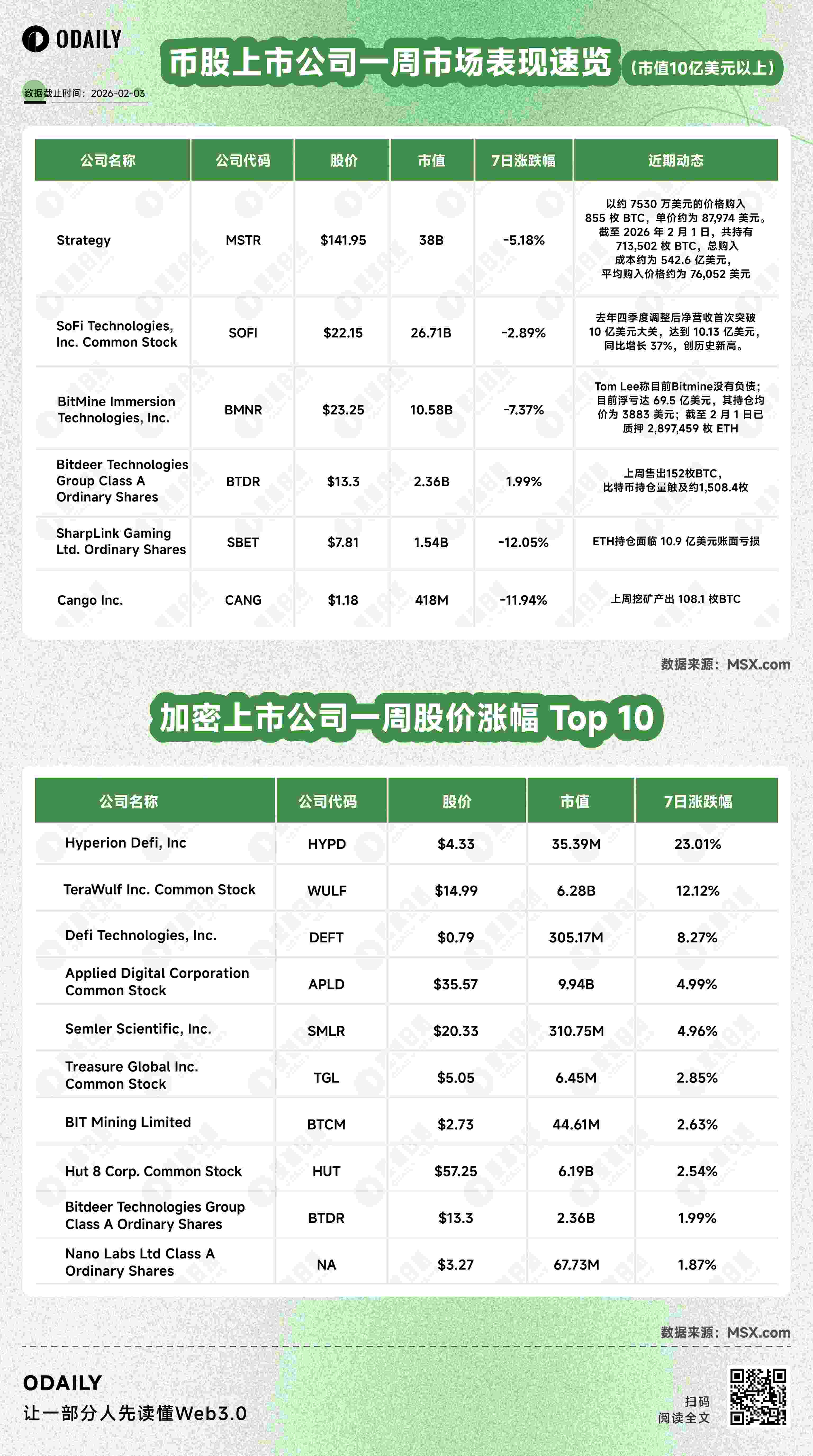 以下为 Odaily 星球日报总结整理的上周币股市场信息,所有美股数据皆来自msx.com。