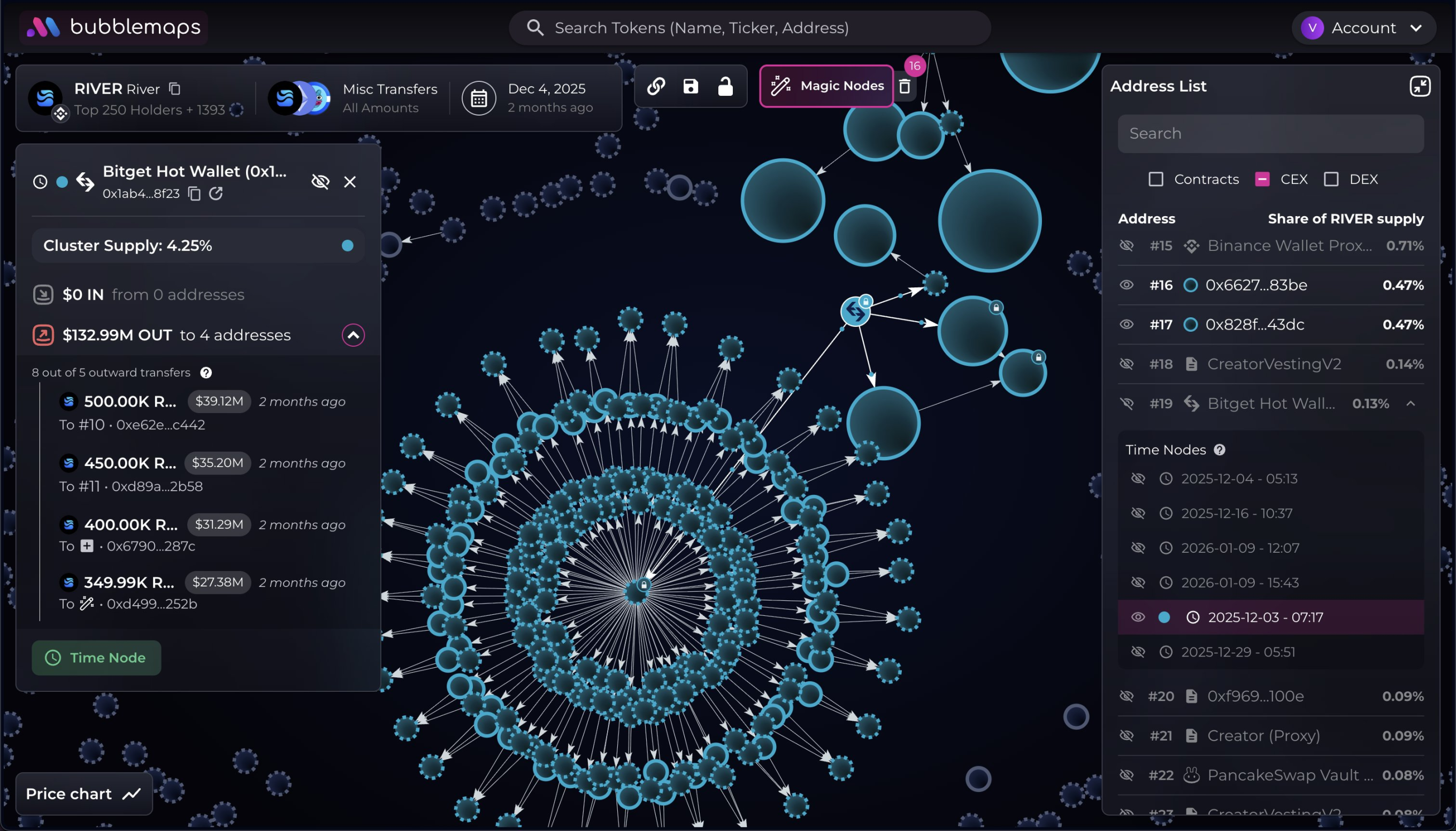 其指出,RIVER 在上线一个月后,有 7 个地址从 Bitget 提取了 2.30 亿枚 RIVER 代币,这些钱包此前没有活动记录,且在 12 月 3 日和 29 日紧密时间窗口内接收了代币。