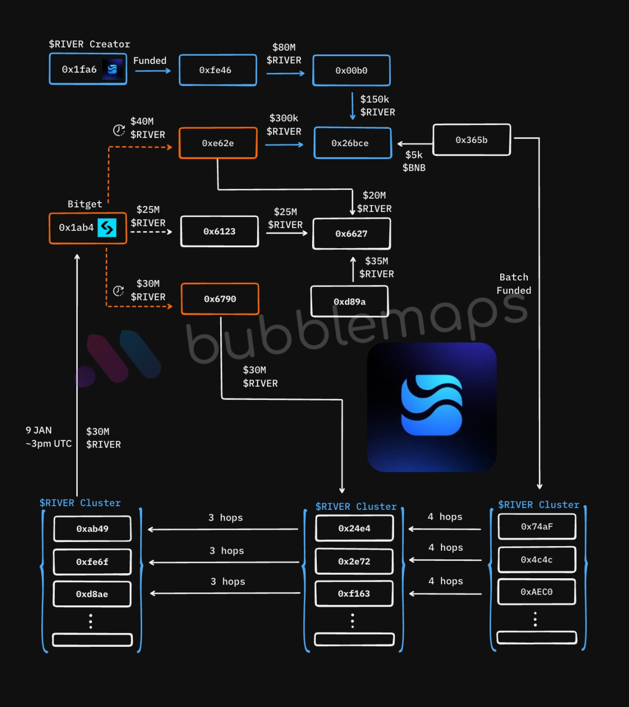 其中一个钱包 0x6790 在数百个钱包中分散了 40 万枚 RIVER。所有这些接收的钱包显示相似模式,之前没有任何活动,收到数量相近的 RIVER,于 1 月 9 日向 Bitget 发送代币,很可能是为了出售,由单一来源提供资金,且经过四层跳转。