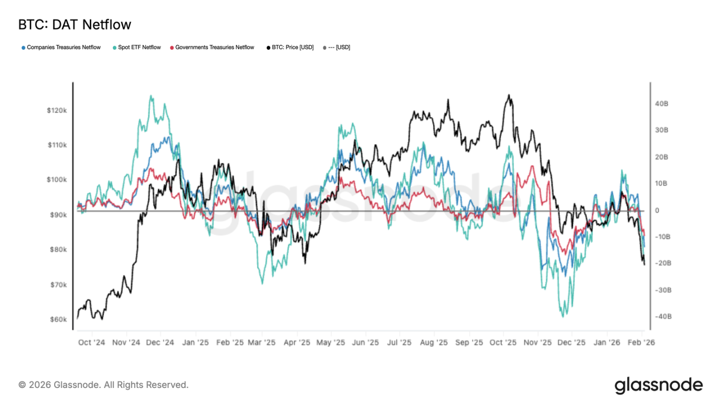 随着价格下跌,主要机构投资者的需求明显减弱。现货 ETF 资金流入放缓,企业和政府相关资金也在减少,显示增量资金入场意愿下降。