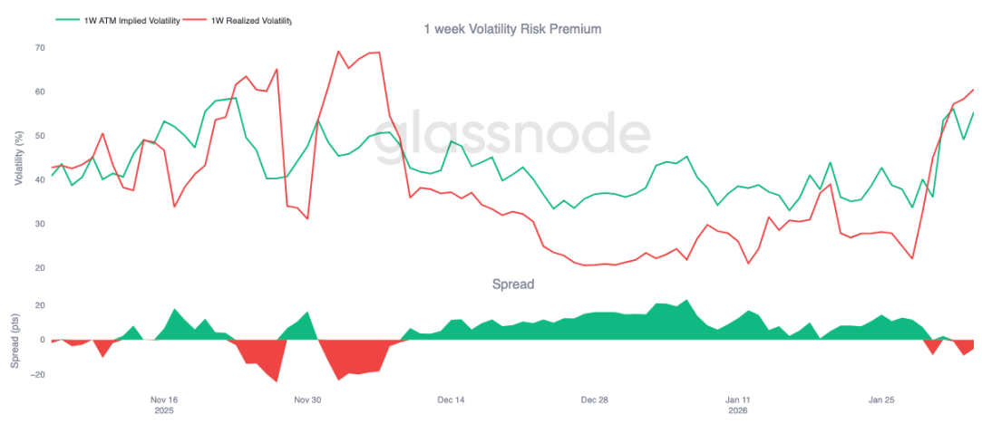 1 周期波动率风险溢价自 12 月初以来首次转为负值,目前约为 -5,而一个月前还在 +23 左右。