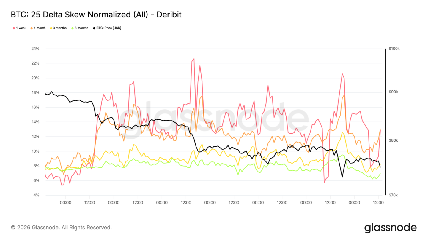 波动率重新定价呈现明显方向性特征。看跌期权相对看涨期权的偏斜度再次扩大,显示市场更关注下行风险而非反弹机会。