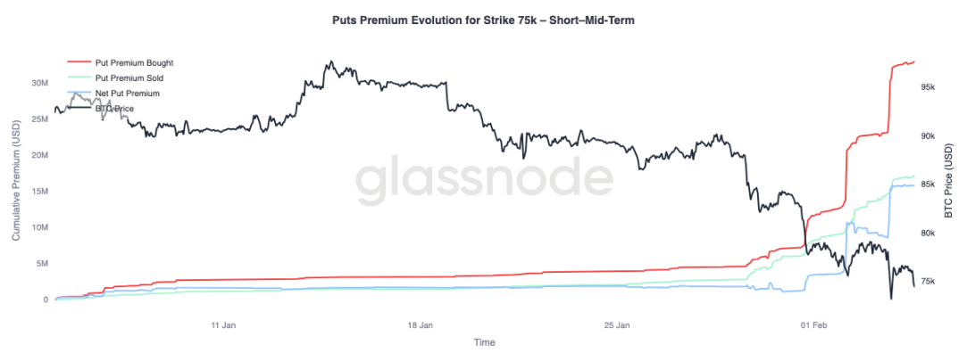 75,000 美元行权价的看跌期权成为市场关注焦点,该水平被反复测试。看跌期权净买入溢价显著增加,这一过程分三个阶段推进,每次都与价格下跌而缺乏有效反弹同步。