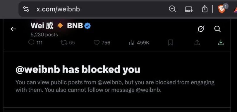 更耐人寻味的是,这个拥有 86.3 万粉丝的账号早已将 CZ 屏蔽。