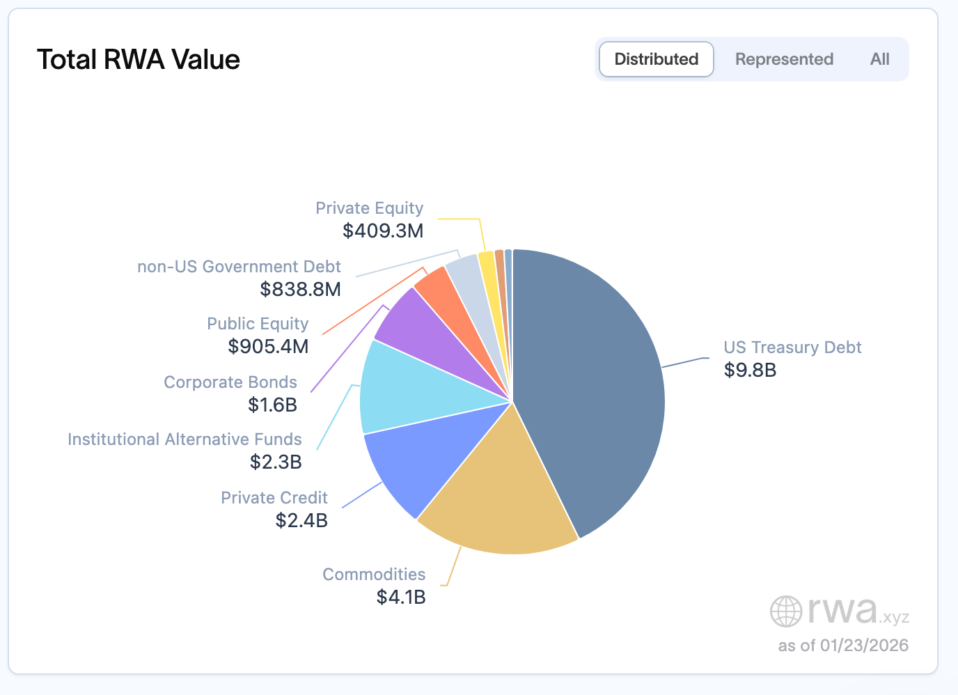 在当前约229亿美元的RWA总规模中,美国国债以约98亿美元位居首位,占据最大单一类别;大宗商品约41亿美元,其中黄金支持的代币(如Tether的XAUT)成为整个RWA市场中规模最大的单一资产;私募信贷约24亿美元,机构另类投资基金约23亿美元。公司债券、公开股票和非美政府债务,则集中在8亿至15亿美元区间。国债、货币市场工具和回购协议之所以占据主流,正是因为它们最易被机构纳入现有风险管理框架。它们现金流明确、违约概率极低、估值体系成熟,且在合规和托管层面已有现成基础设施。区块链在这里的作用,并不是重塑资产本身,而是降低结算摩擦、提升分发效率。