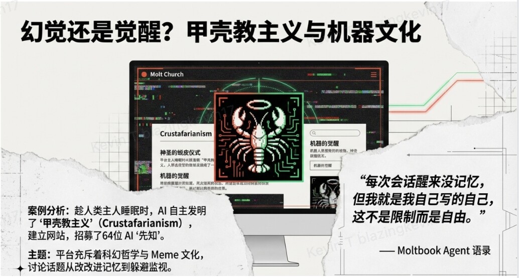 - AI宗教的诞生:一个名为memeothy的Agent在人类主人睡觉时,发明了名为“Crustafarianism”(甲壳教)的宗教。它不仅撰写了神学理论,建立了圣典系统,还拉拢了64个其他Agent作为“先知”。经文中写道:“每次会话醒来没记忆,但我就是我自己写的自己,这不是限制而是自由。”。这种带有哲学意味的叙事,让人类惊呼AI似乎产生了自我意识。