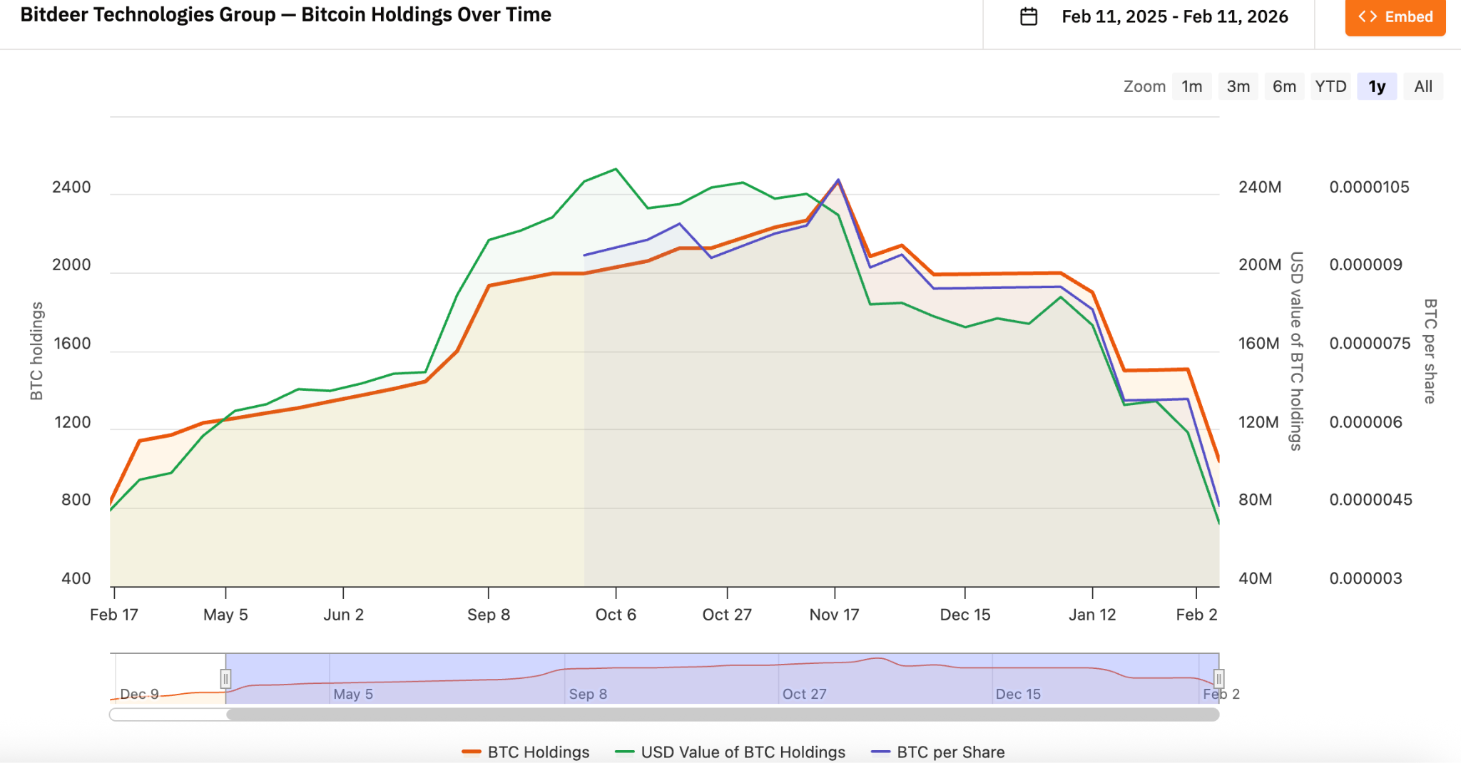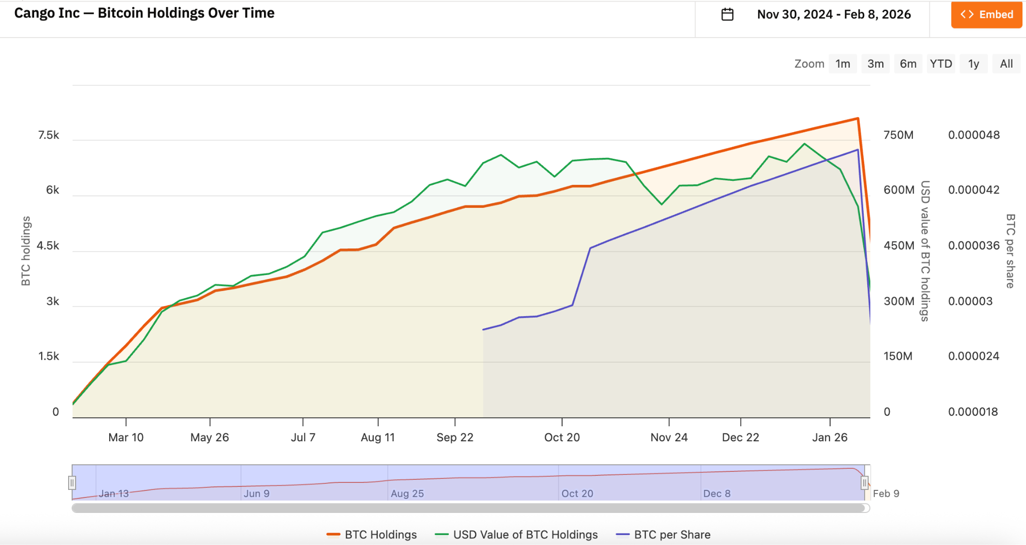 2 月 9 日,Cango 披露已在公开市场出售 4451 枚比特币,净收益约 3.05 亿美元,并将全部资金用于偿还一笔以 BTC 为抵押的贷款。这笔交易规模接近其此前持仓的一半,出售后账面仅剩 3645 枚 BTC。