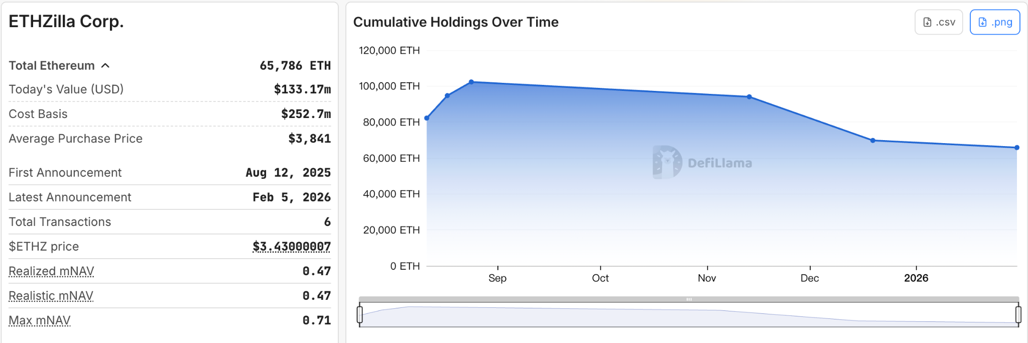 2025 年 11 月 13 日,ETHZilla 开始首次减仓 8293 枚 ETH;12 月 25 日,ETHZilla 披露已出售 24291 枚 ETH,所得款项约 7,450 万美元,此次交易是作为赎回尚未结清的高级有担保可转换票据的一部分,也是首个ETH财库减持样本。当前,ETHZilla 的 ETH 持仓量约为 6.57 万枚。