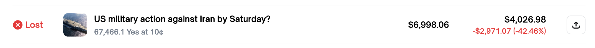 值得一提的是,Odaily星球日报查询发现 Rundeep 在 Polymarket 上除去这“六战六胜”外还有过唯一一次失手,但此次失手的预测事件与以色列无直接关系,而是“美军是否会在周六(2025 年 6 月 21 日)前对伊朗采取行动”……看来盟军情报还是不太靠得住。