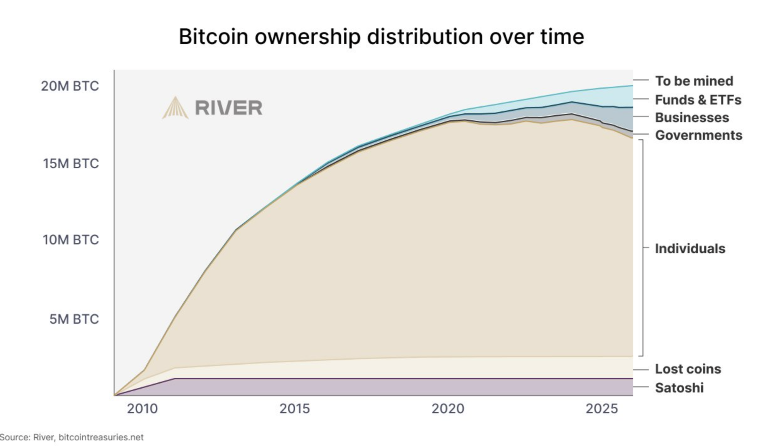 2025 年的卖盘主要来自长期持有者与巨鲸,这些早期参与者多年前完成建仓,如今在更深、流动性更好的市场中逐步出货。如果这一趋势持续,十年内机构可能持有比特币的大部分流通盘,但目前个人仍掌控约三分之二的供应量。