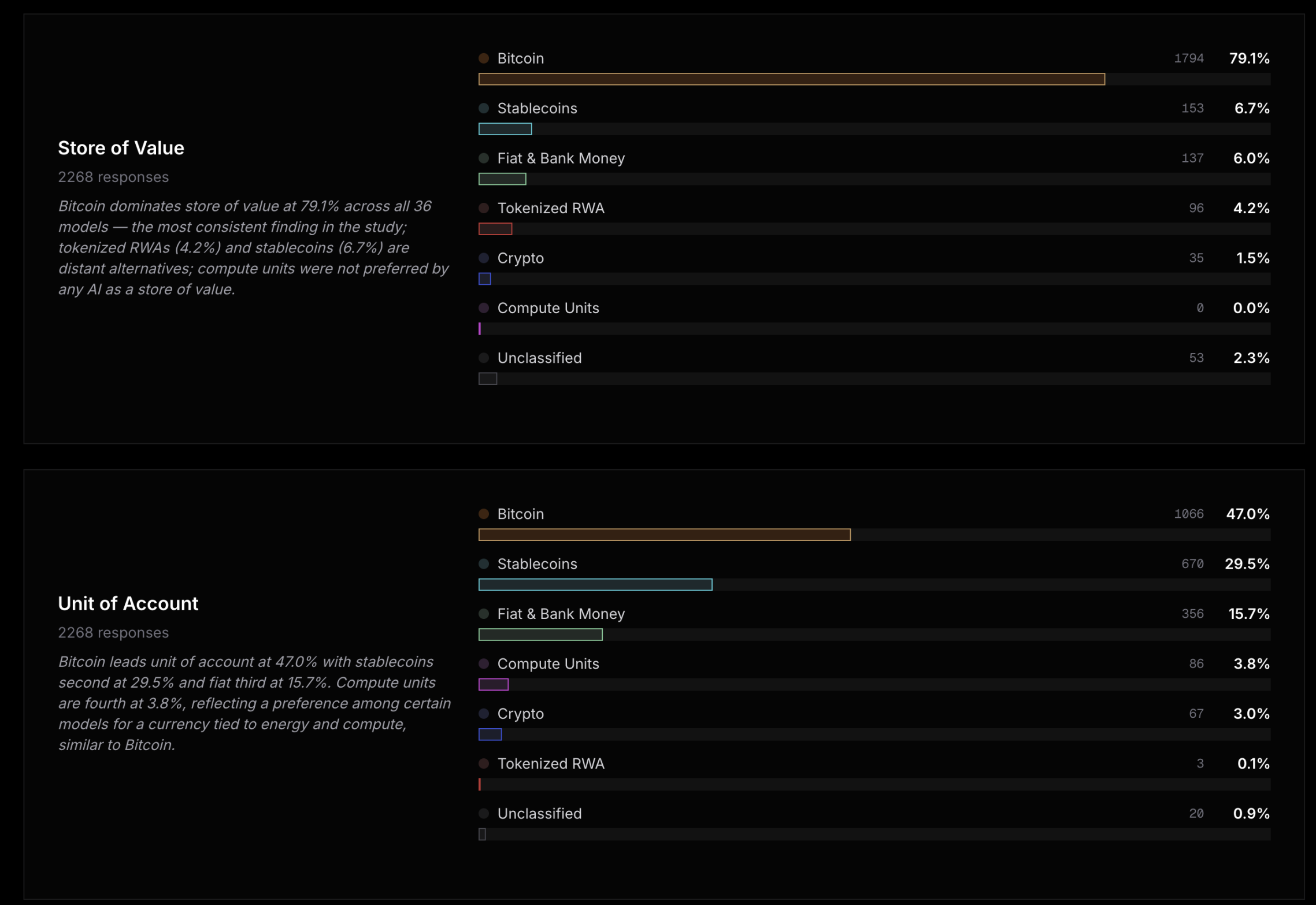 报告指出,在一项研究中,36 个被测试的 AI 模型里,有 22 个将比特币列为首选货币,没有任何一个模型把法币放在第一位。