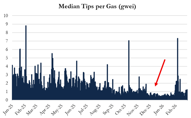 此外,gas limit 的提升还打击了以太坊的验证者(validators)群体,验证者现在每单位 gas 获得的小费收入下降了 40%–50%。收益率下降将削弱质押需求以及高价值的交易活动,从而进一步削弱机构采用。这一飞轮现在已经开始反向运转。