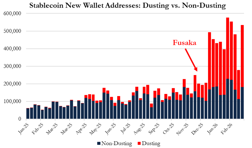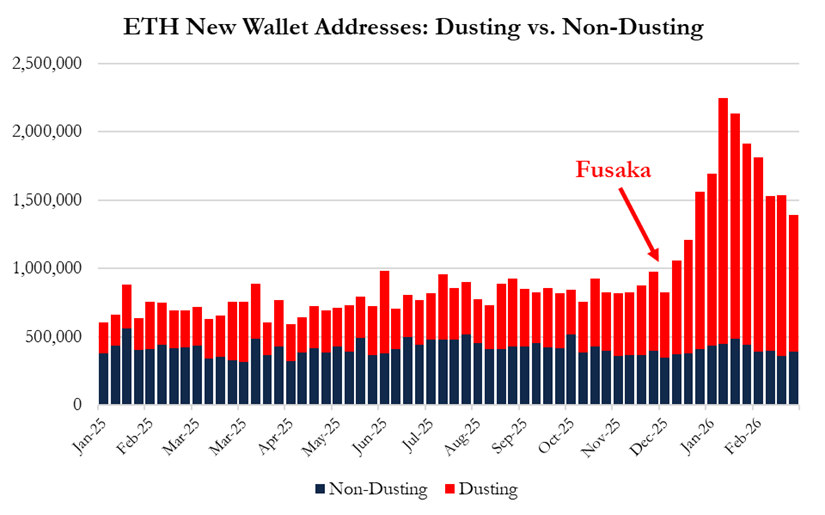 我们对 2025 年 1 月至 2026 年 2 月的链上数据进行了全面分析,结果显示 Lee 所称的“机构采用带来了以太坊的活动增长”,实际上可以用大量低价值的地址投毒(address poisoning)与粉尘攻击(wallet dusting)行为来解释。这些行为是 Fusaka 升级后区块空间过剩所引发的。