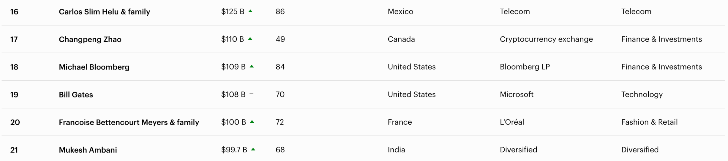 币安创始人赵长鹏身价已经达到了 1100 亿美元,位列全球第 17 名,超越微软创始人比尔盖茨以及彭博社创始人 Michael Bloomberg。这也是赵长鹏首次踏足千亿美元俱乐部,成为了全世界仅有的身价达到 12 位数的 20 人的其中之一。