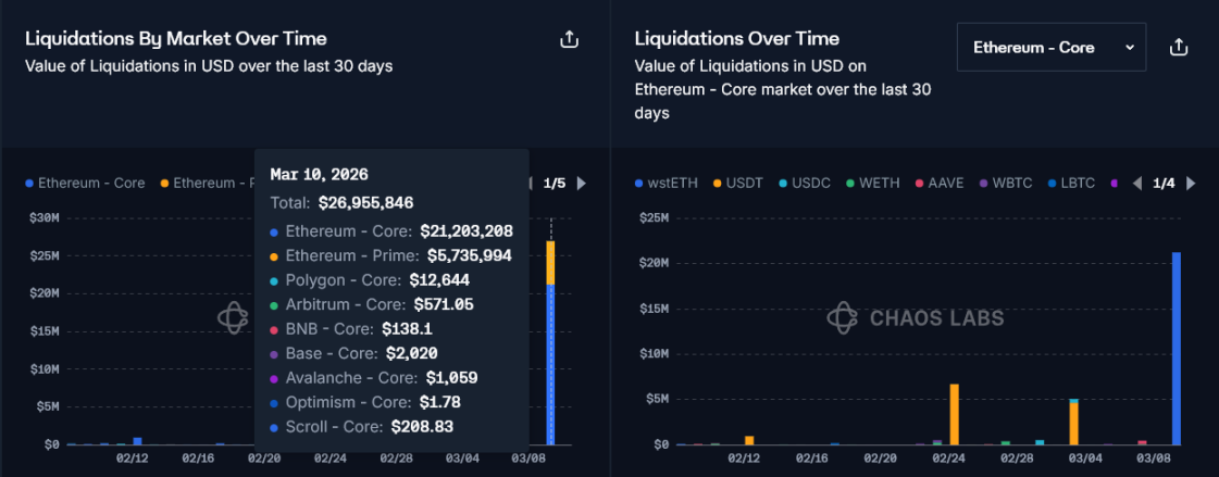 3 月 11 日凌晨,去中心化借贷协议 Aave 发生了一次罕见的异常清算。没有市场暴跌,也没有外部攻击,但约 2700 万美元的借贷仓位在数小时内被强制平仓,34 个账户、合计约 10,938 枚 wstETH 遭到链上清算机器人「收割」。