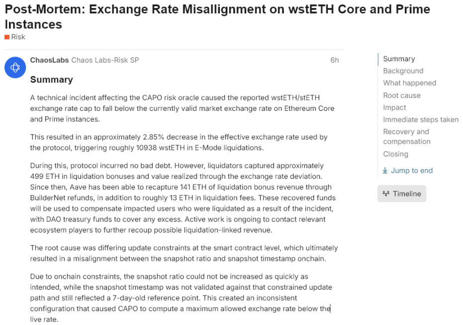 与大多数清算事件不同,这次没有市场暴跌,没有外部攻击,也没有喂价数据源的失真。Aave 风险管理合作方 Chaos Labs 随后在治理论坛发布的 Post-Mortem 报告中厘清了真相。