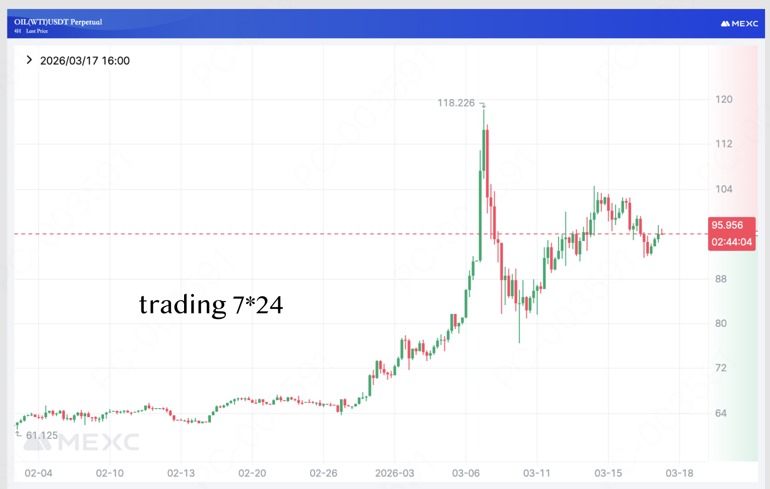 上周六晚间,在主流衍生品市场开盘前约20小时,MEXC 平台上的WTI原油永续期货价格飙升至每桶约96美元,高于周五下午常规原油期货90.90美元的收盘价 。在这场由突发冲突引发的行情中,加密平台率先完成了资产的重新定价,其无缝运转的机制,让传统交易所固守的休市制度显得无比滞后。