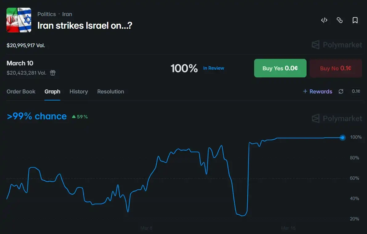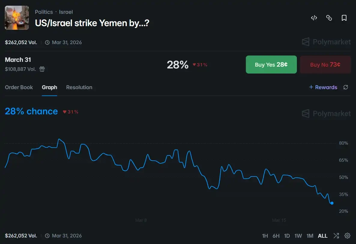目前在 Polymarket 上仍有许多类似交易市场。例如「美国/以色列是否会在 3 月 31 日前打击也门?」,其结算规则与前述如出一辙,交易量为 10 万美元。