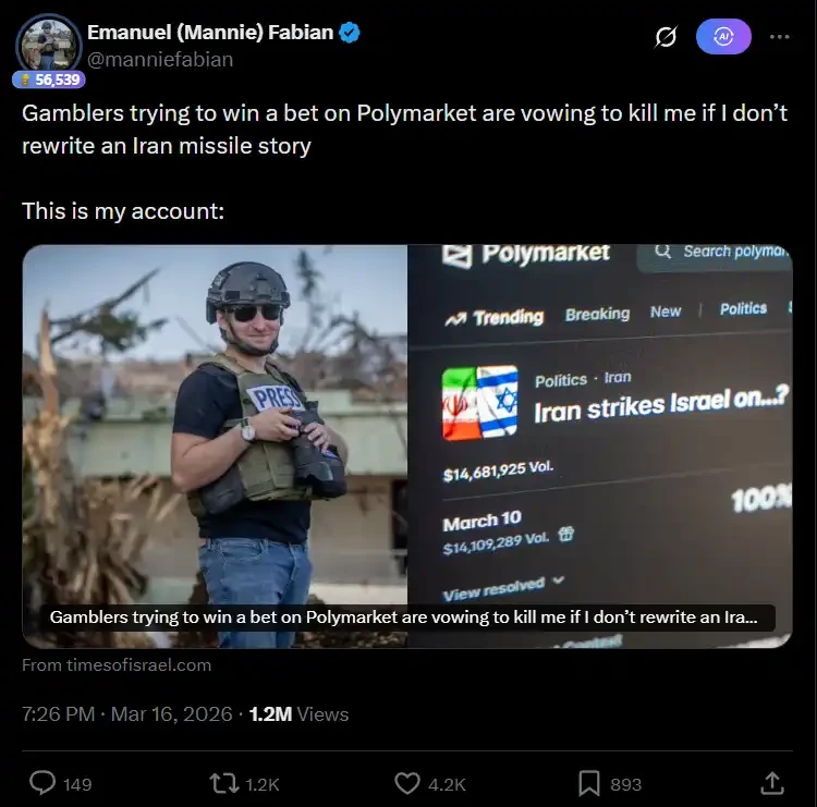 然而,Fabian 此次的遭遇,揭开了预测市场此前从未触及的黑暗领域。在逐利动机驱动下,一部分参与者不再满足于「解读信息」,而是开始尝试影响信息、扭曲信息,甚至制造信息。