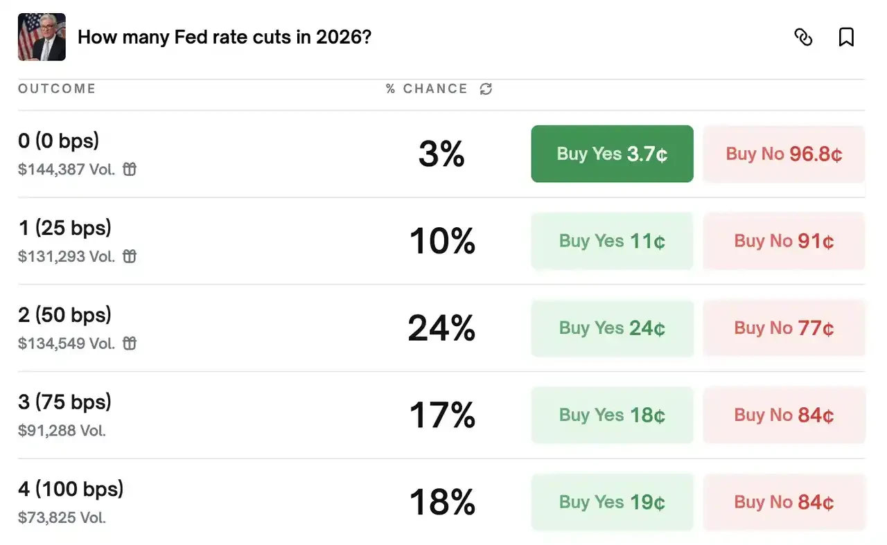今年年初 polymarket 上预测 2026 年的降息次数概率最高的是 2 次