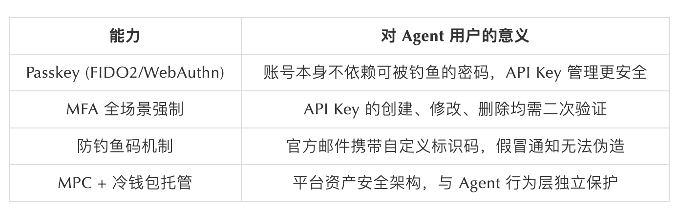 除了 Agent 相关的安全机制之外,交易平台本身的账户安全体系同样会对 Agent 用户产生重要影响。例如:
