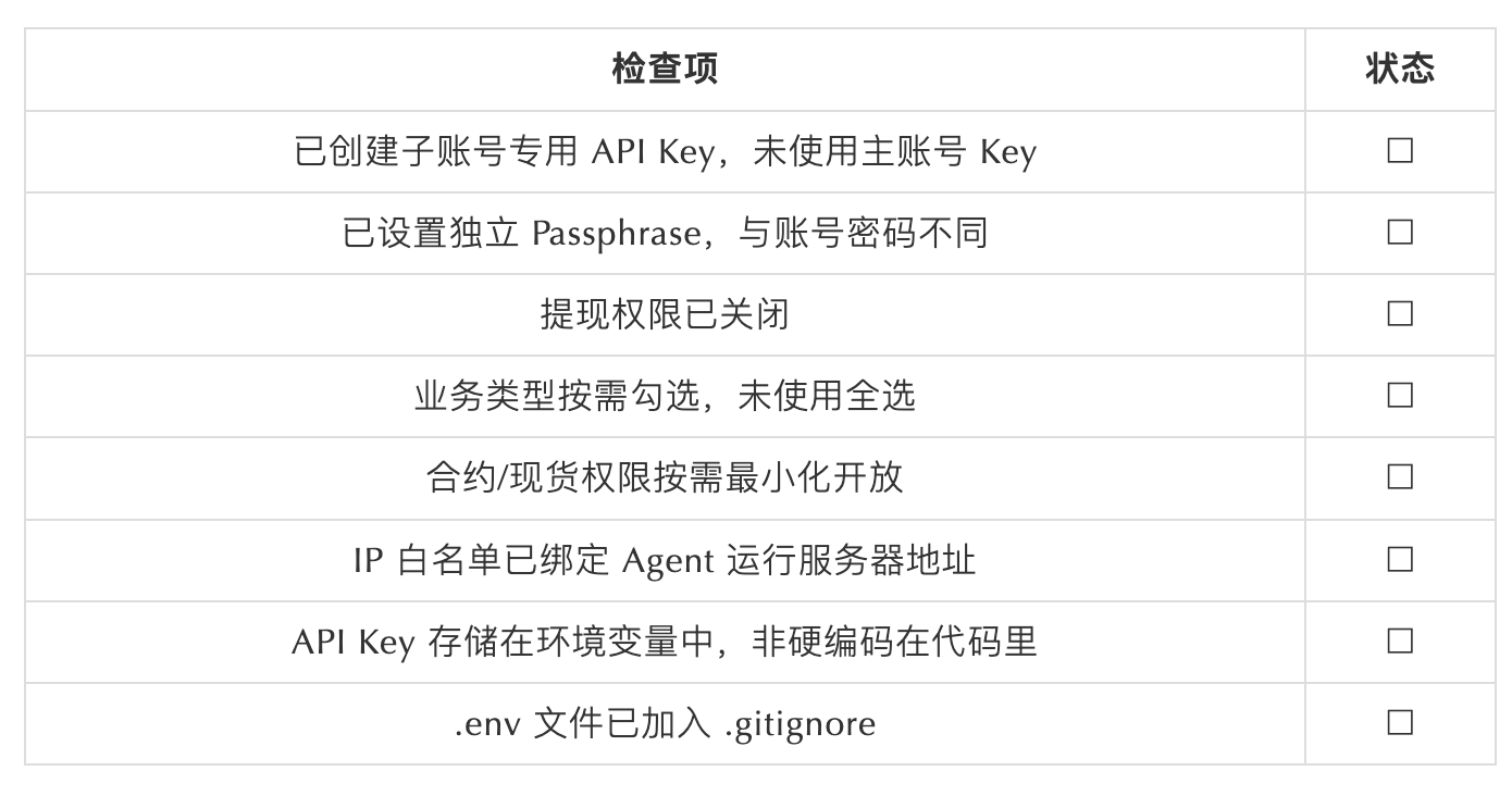 AI Agent 的核心操作依赖于 API 接口,因此平台在 API 权限设计上通常需要支持细粒度控制,例如交易权限划分、IP 来源限制以及额外的安全验证机制。通过这种权限模型,用户可以仅向 Agent 授予完成任务所需的最小权限范围。