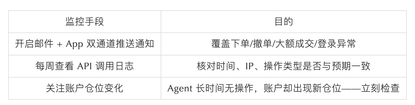 在 AI Agent 自动交易场景中,安全问题往往不会表现为一次性的异常行为,而是可能在系统持续运行的过程中逐步发生。因此,除了账户安全与 API 权限控制之外,还需要建立持续的交易监控与异常检测机制,以便在问题出现的早期阶段及时发现并干预。