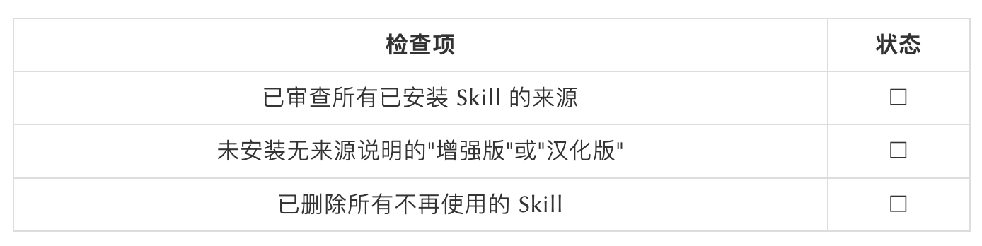 - 警惕社区”增强版”、”汉化版” Skill——任何非官方版本都是风险