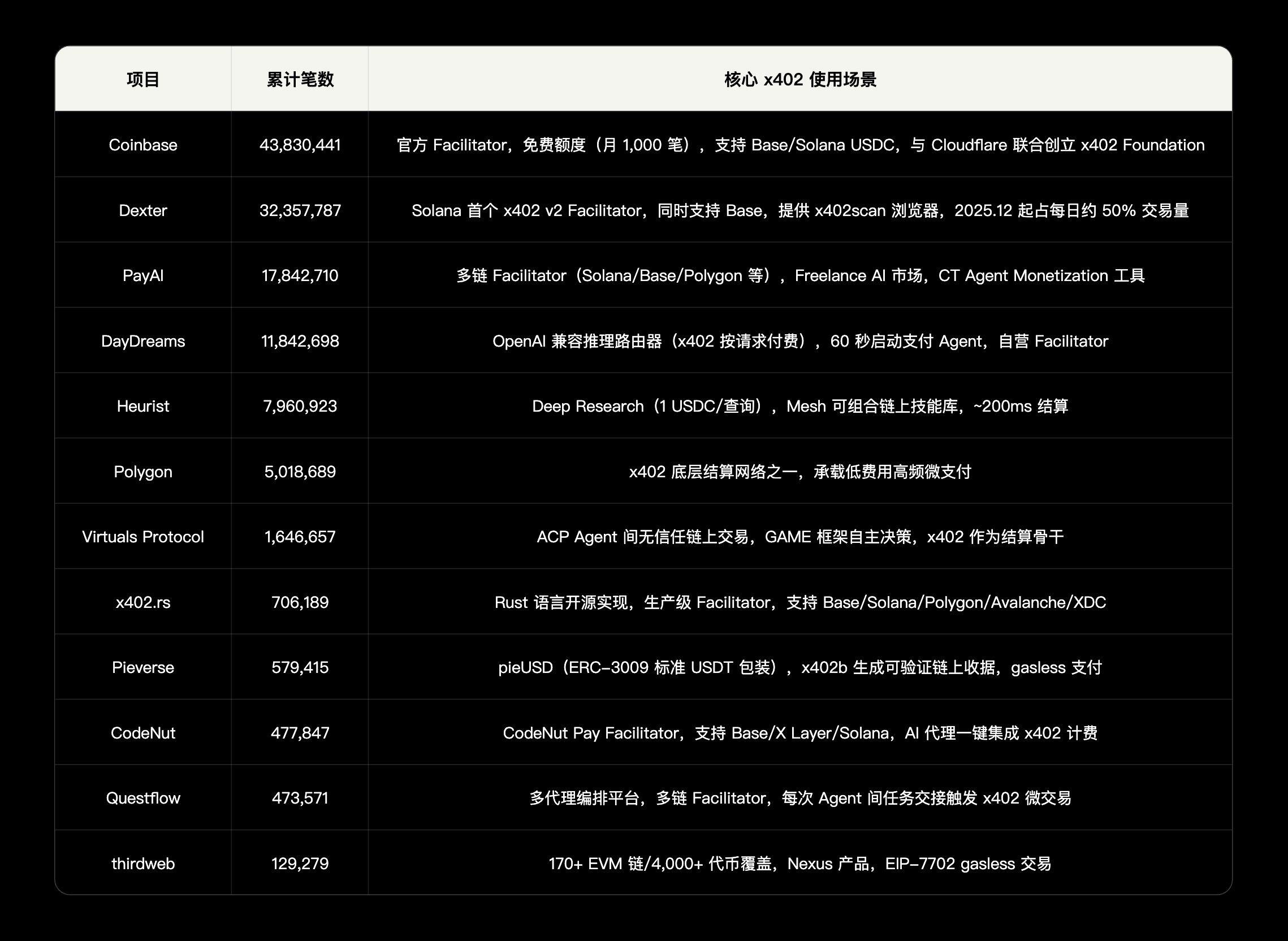 x402(支付层)由 Coinbase 与 Cloudflare 联合推出,将稳定币微支付嵌入 HTTP 协议层。截至 2025 年底已处理超过 1 亿笔交易,年化支付量达 6 亿美元。