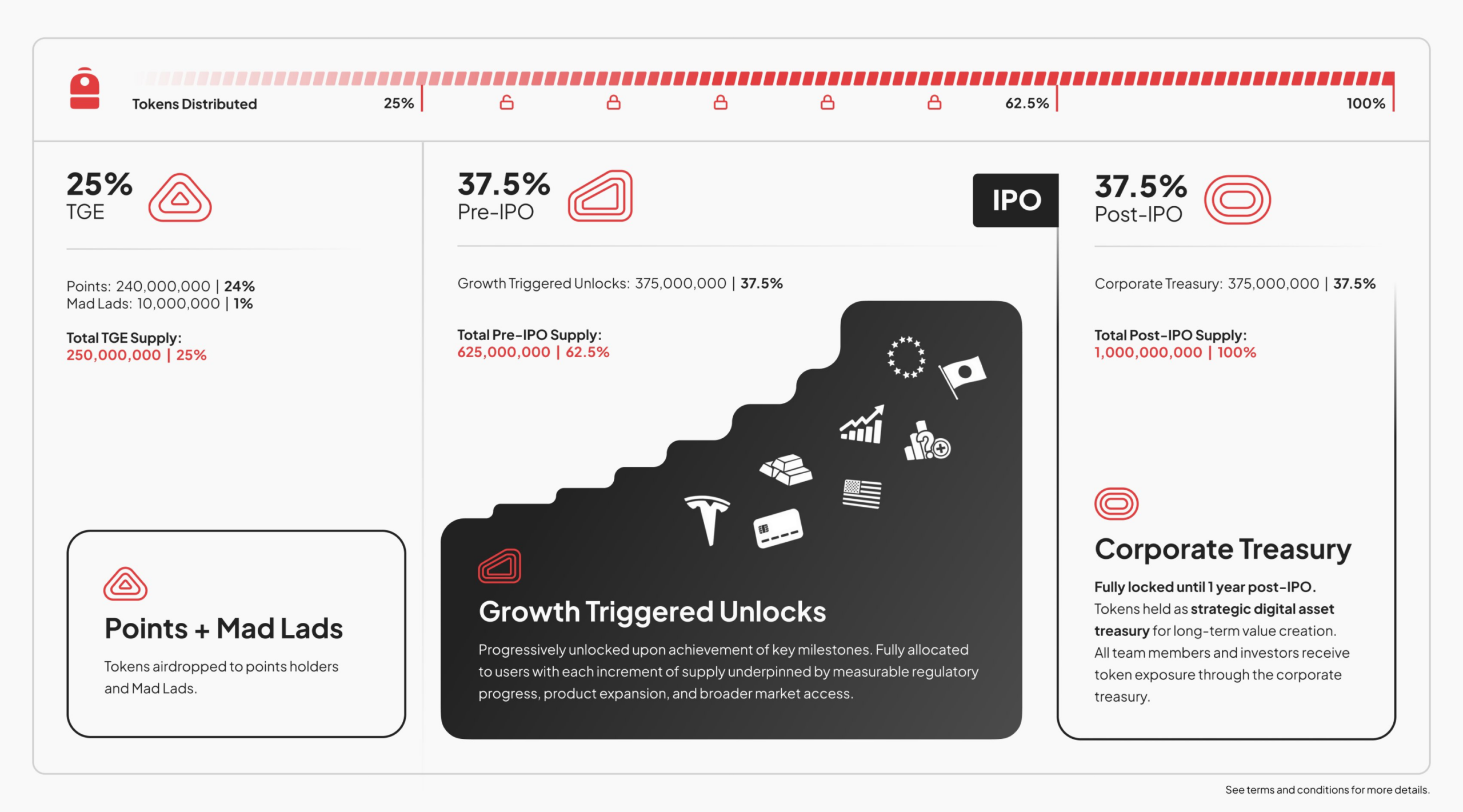 25% 代币将在 TGE 时解锁(积分持有者 24%;Mad Lads 1%)。37.5% 的代币将在 IPO 前解锁。根据关键里程碑逐步解锁。全部代币分配给达到每个供应增量里程碑的用户,这些里程碑以可衡量的监管进展、产品扩展以及更广泛的市场准入为基础。