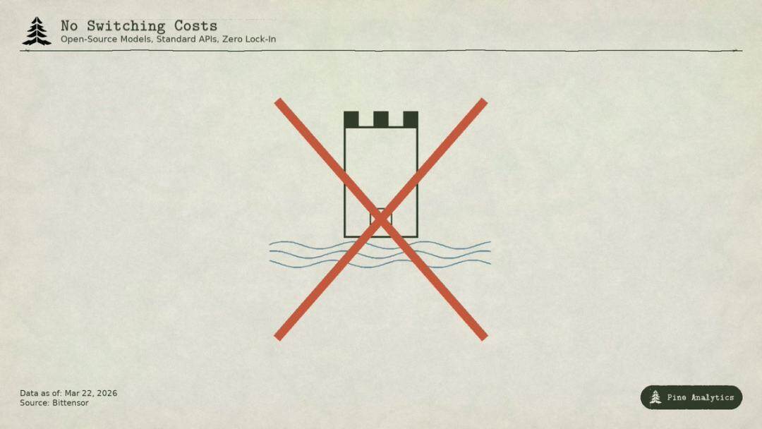 有人会拿互联网早期补贴获客类比,但 Uber、DoorDash、AWS 在补贴期建立了转换成本:专有平台、司机网络、企业生态。而 Bittensor 子网没有任何壁垒:模型开源、接口标准化,用户可以零成本切换服务商。补贴一旦退潮,没有任何锁仓机制能留住用户。