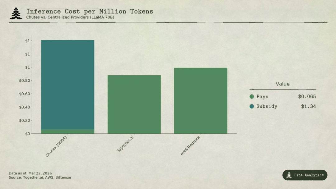 这意味着,去掉补贴后 Chutes 价格将比中心化方案贵 1.6–3.5 倍。所谓 85% 的成本优势完全反转,其低价本质是 TAO 持有者通过通胀买单,而非去中心化带来的结构性效率。