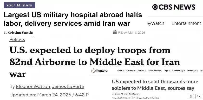美国第 82 空降师取消「联合战备训练中心」轮训、通常海运的第 82 战斗航空旅用运输机空运、驻中东美军基地血库储备增加 500%、全球最大的美国国防部海外医院——德国兰德斯图尔医疗中心——暂停部分民用服务。