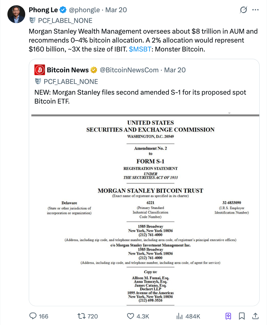 Strategy(原 MicroStrategy)CEO Phong Le 则从规模角度做了更激进的测算。他在 X 平台发文指出,摩根士丹利财富管理部门管理约 8 万亿美元资产,目前建议客户将 0-4%的投资组合配置于加密资产。按 2%的配置比例计算,潜在资金规模约为 1600 亿美元,相当于贝莱德 IBIT 当前约 550 亿美元管理规模的近三倍。他将 MSBT 称为「Monster Bitcoin」。