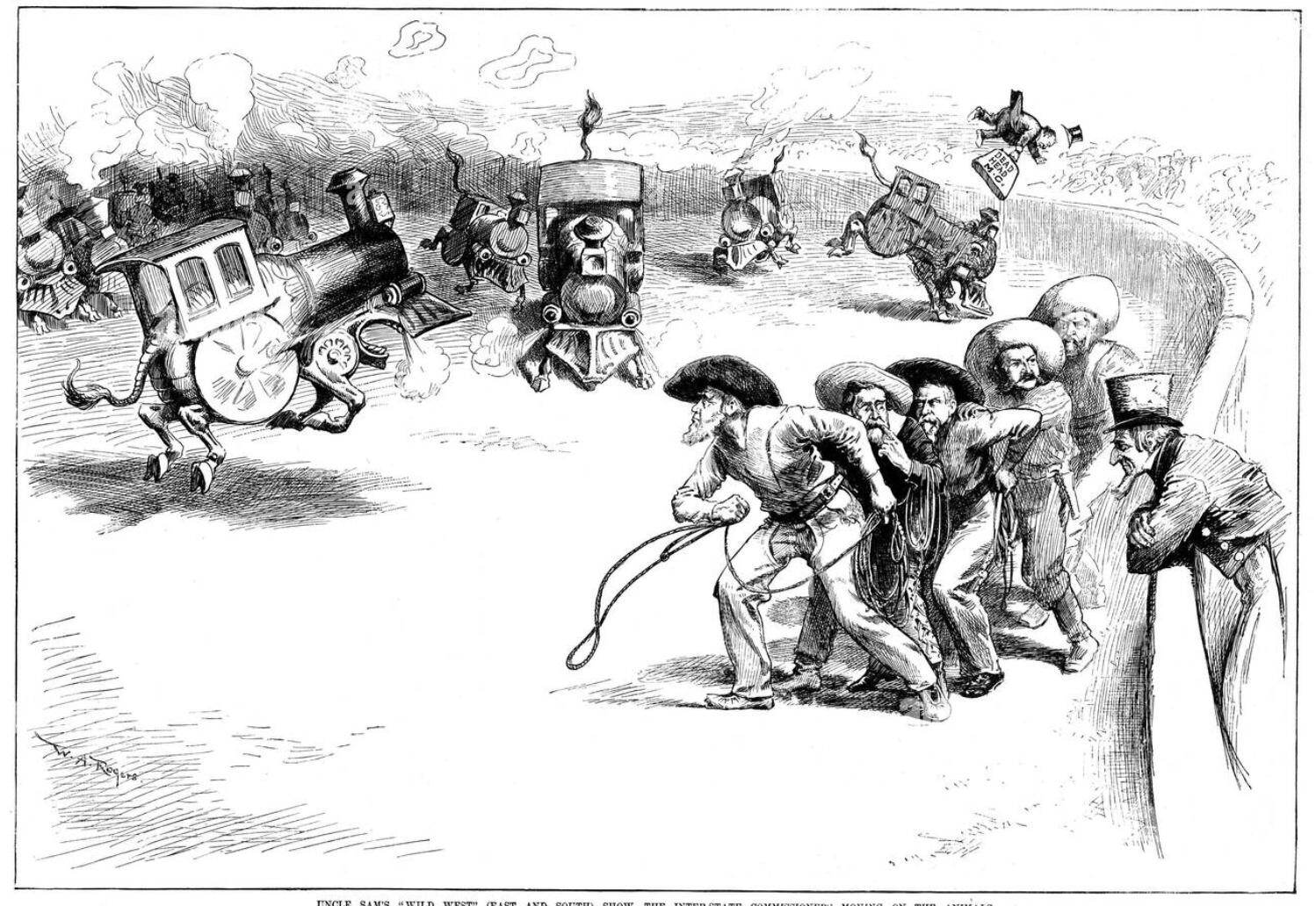 1887 年,美国漫画家 W.A. Rogers 以讽刺画的方式,表现国会通过《州际商业法》、设立“州际商业委员会”(ICC)监管铁路业的场景。