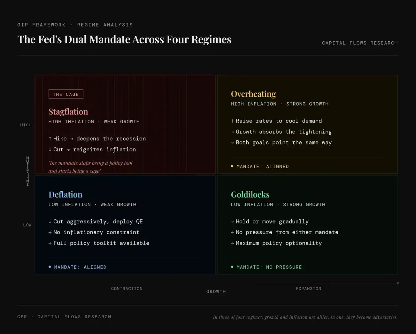 本图呈现出美联储「就业 + 通胀」的双重使命在四种经济状态下的表现。左上(滞胀)表示高通胀与低增长并存,此时无论加息还是降息都会带来新的问题,政策目标相互冲突,双重使命从工具变成束缚;右上(经济过热)表示高通胀与高增长并存,加息既能抑制通胀、又不会立即伤害经济,两个目标方向一致,政策相对容易执行;左下(通缩)表示低通胀与低增长并存,此时可以放心降息、放水来刺激经济,不受通胀约束,政策空间充足;右下(金发姑娘)表示低通胀与高增长并存,经济与价格都处于理想状态,政策无需过多干预,灵活性最高。