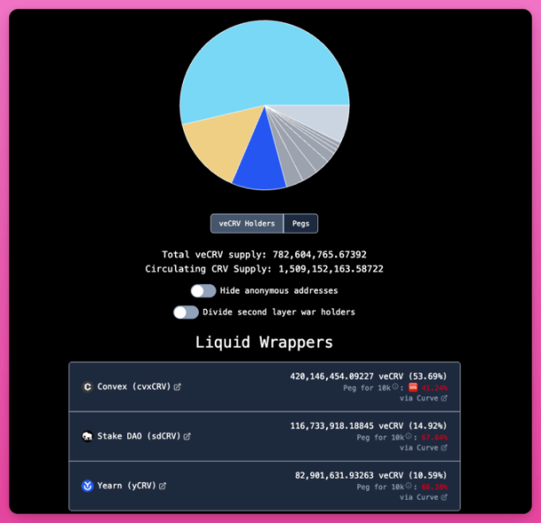 在 Curve 的案例中,这一悖论产生了稳定(即便集中)的结果。Convex 持有全部 veCRV 的 53%。StakeDAO 和 Yearn 持有额外份额。
