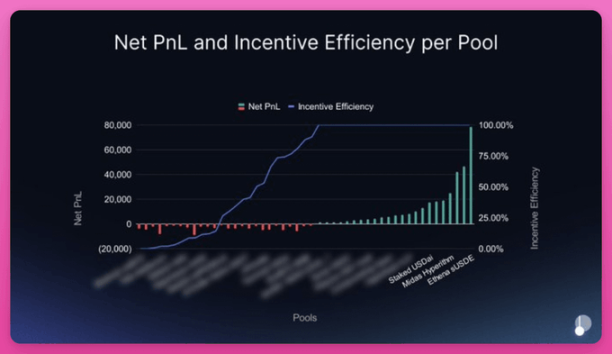 Pendle 的整体费用效率超过 1.0 倍(收入大于排放)。但当团队按池子细分时,超过 60% 的池子本身处于亏损状态。