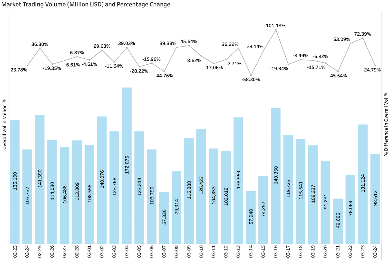 - 3月交易量呈“脉冲式放量+快速回落”,多次出现极端涨跌但缺乏持续性,显示资金以短线驱动为主;全市场市值则温和震荡,中旬见顶后回落至2.45万亿–2.50万亿美元区间,整体动能不足。