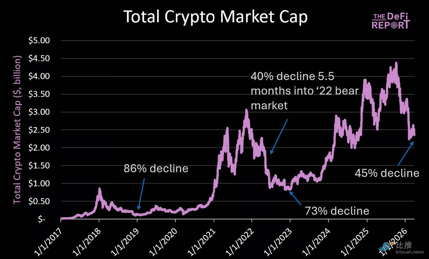 - 如果总市值的跌幅与 22 年对比 18 年的峰谷相对跌幅一致,我们可能会看到加密总市值从峰值下跌 62%,至 1.67 万亿美元(较当前水平再下跌 30%)。
