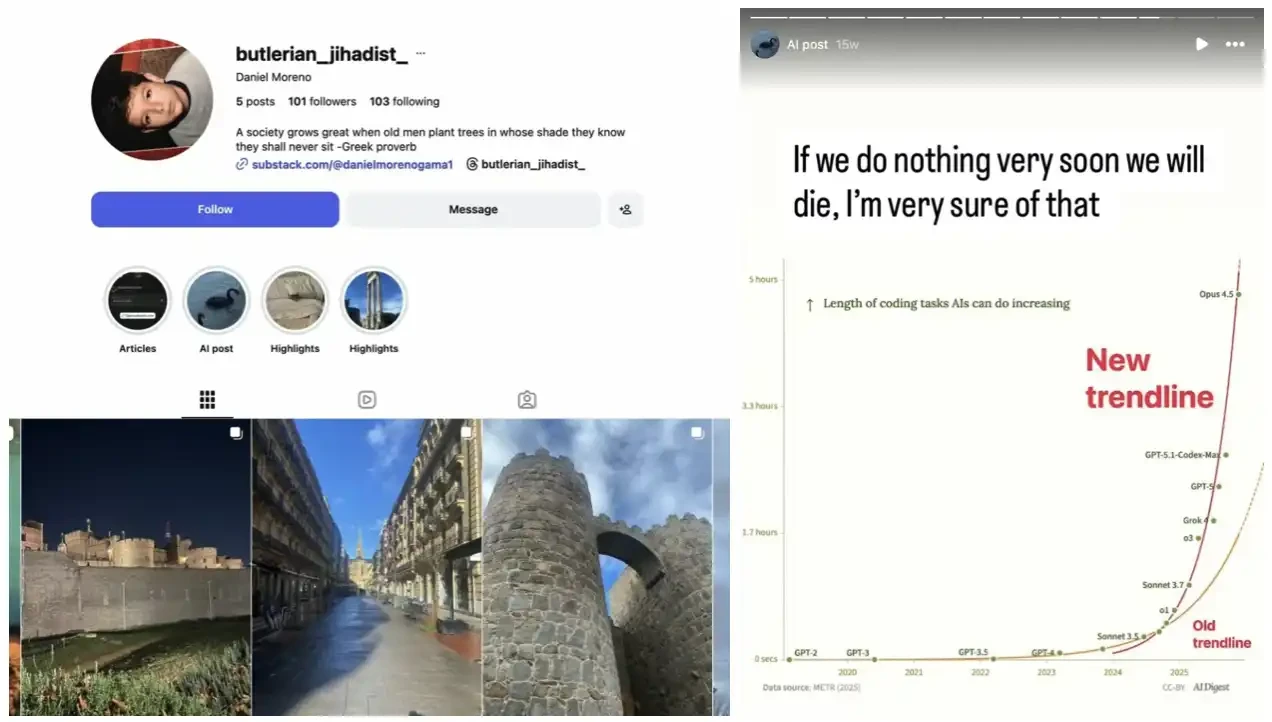 第一起案件的嫌疑人 Daniel Moreno-Gama 是位 AI 悲观主义者。他在社交媒体上引用《沙丘》中人类对抗机器的主题,写文章论证 AI 对齐失效构成存亡级风险,批评科技领袖为追求「超人类主义」而「拿全人类命运豪赌」。